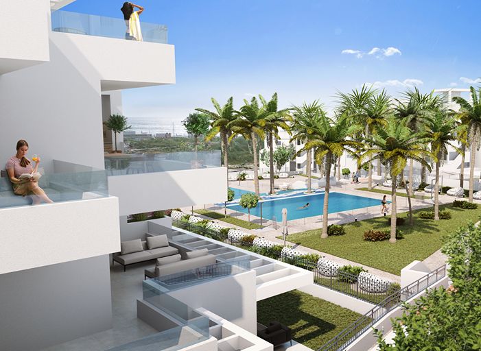 Costafiore Gardens is a boutique development of 35 modern apartments with a Northern European vision and a Mediterranean lifestyle, designed to fully enjoy the charm of Estepona. Penthouse have sea views, and the penthouse come with a private pool. The community features park-like gardens, swimming pools, lawns, flower beds, various trees, and palm trees. The development distinguishes itself with A-brand materials, luxurious Siemar Kitchens, sliding terrace doors, and two parking spaces in the underground garage, and private storage rooms. Costafiore Gardens is walking distance to the beach, nearby amenities, and exclusive golf courses.