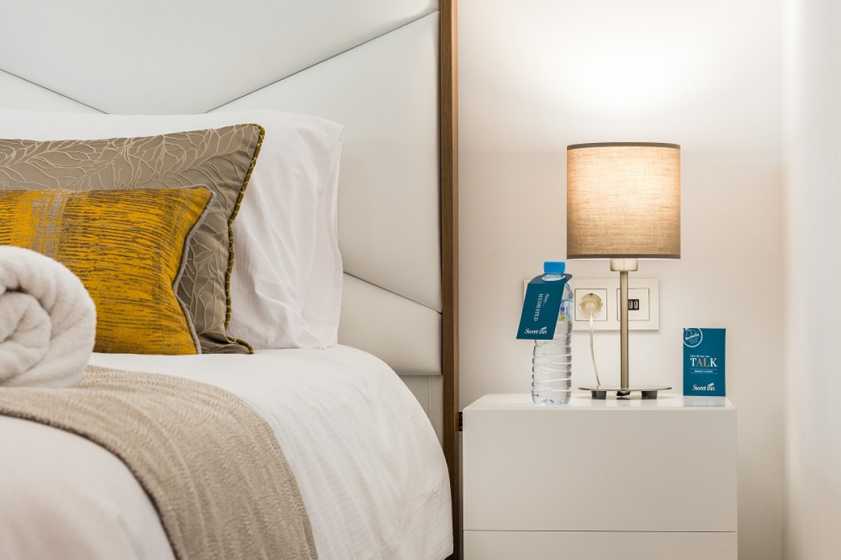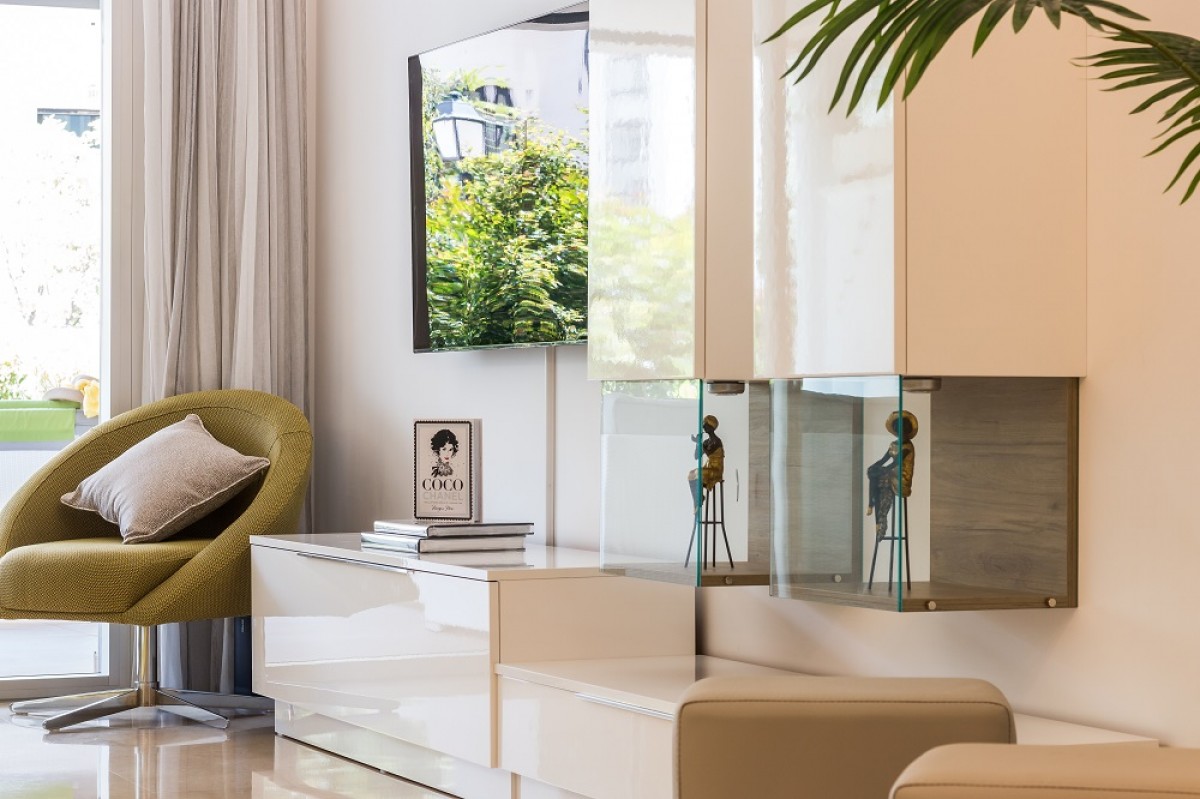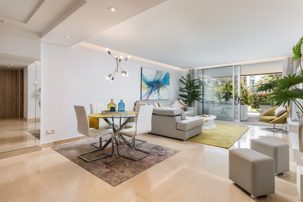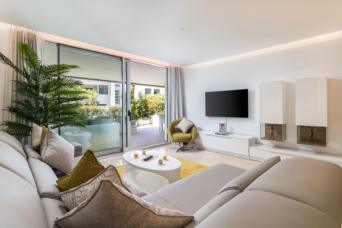The apartment has been furnished beautifully and to a very high standard. The living room with dining area is light and spacious, with access to the covered terrace and private garden, which are south facing, to maximize sun.
