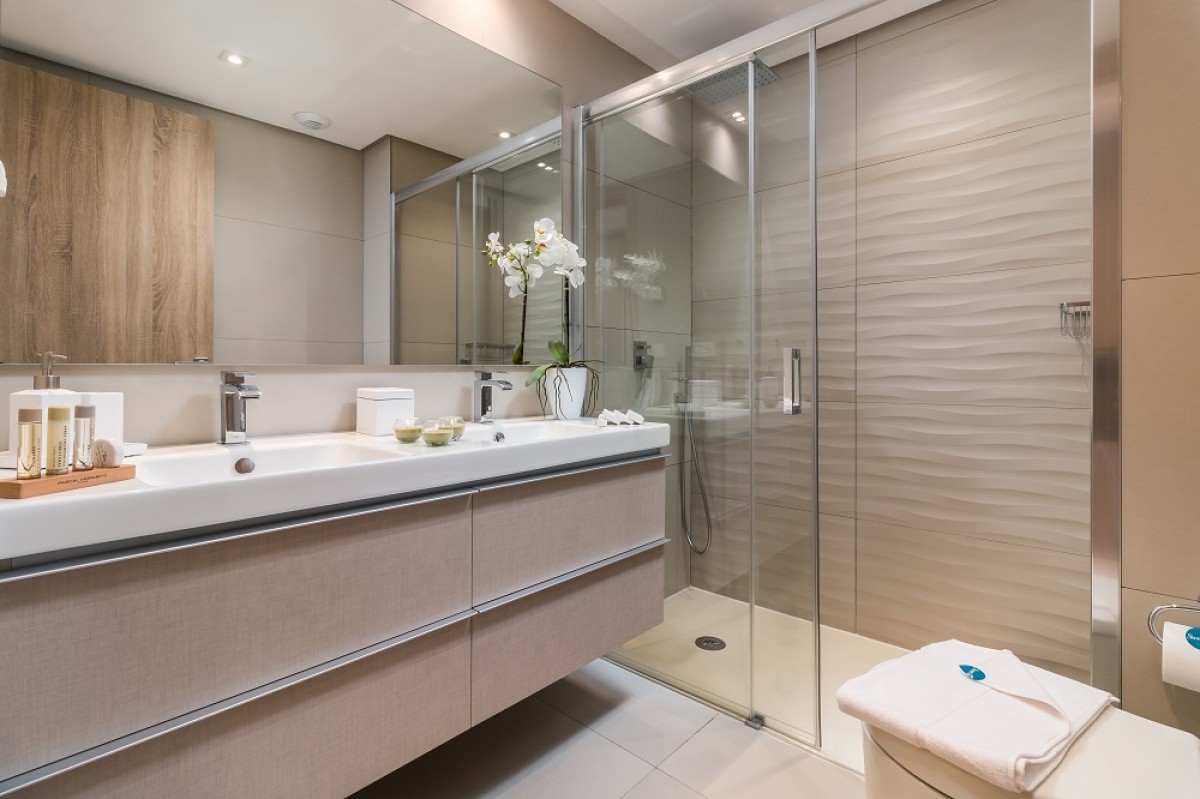 The kitchen is modern, fully equipped and open-plan. There are two bedrooms, the master has a double bed and en-suite bathroom, with shower, and access to the terrace. The guest bedroom has twin beds and a separate bathroom with shower. The property has air-conditioning throughout.