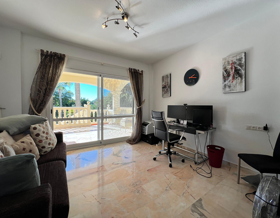 Outside, the villa boasts several sunny terraces, a beautifully landscaped garden, and a large swimming pool surrounded by tropical plants, ideal for relaxing or enjoying the Andalusian sunshine.