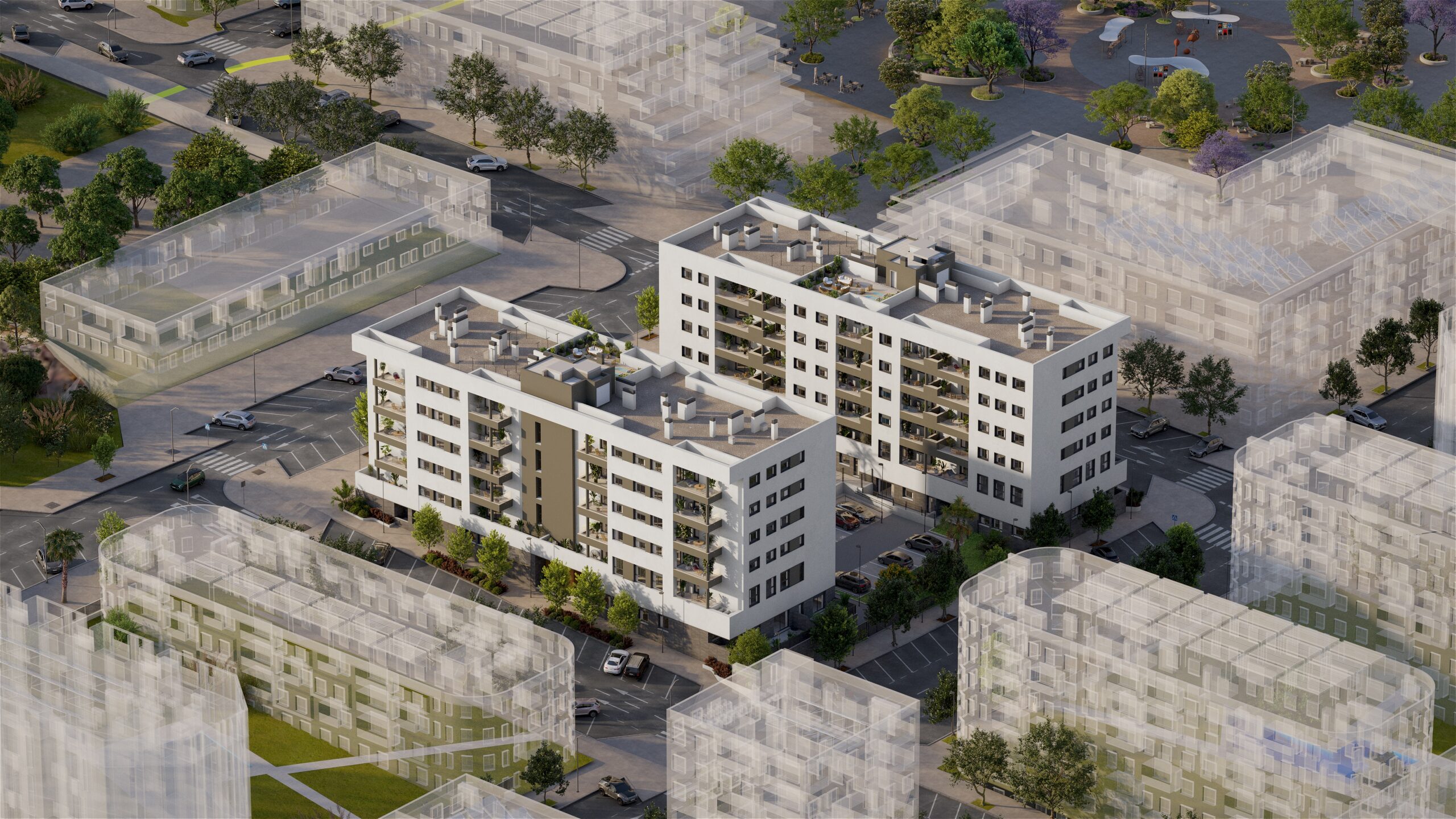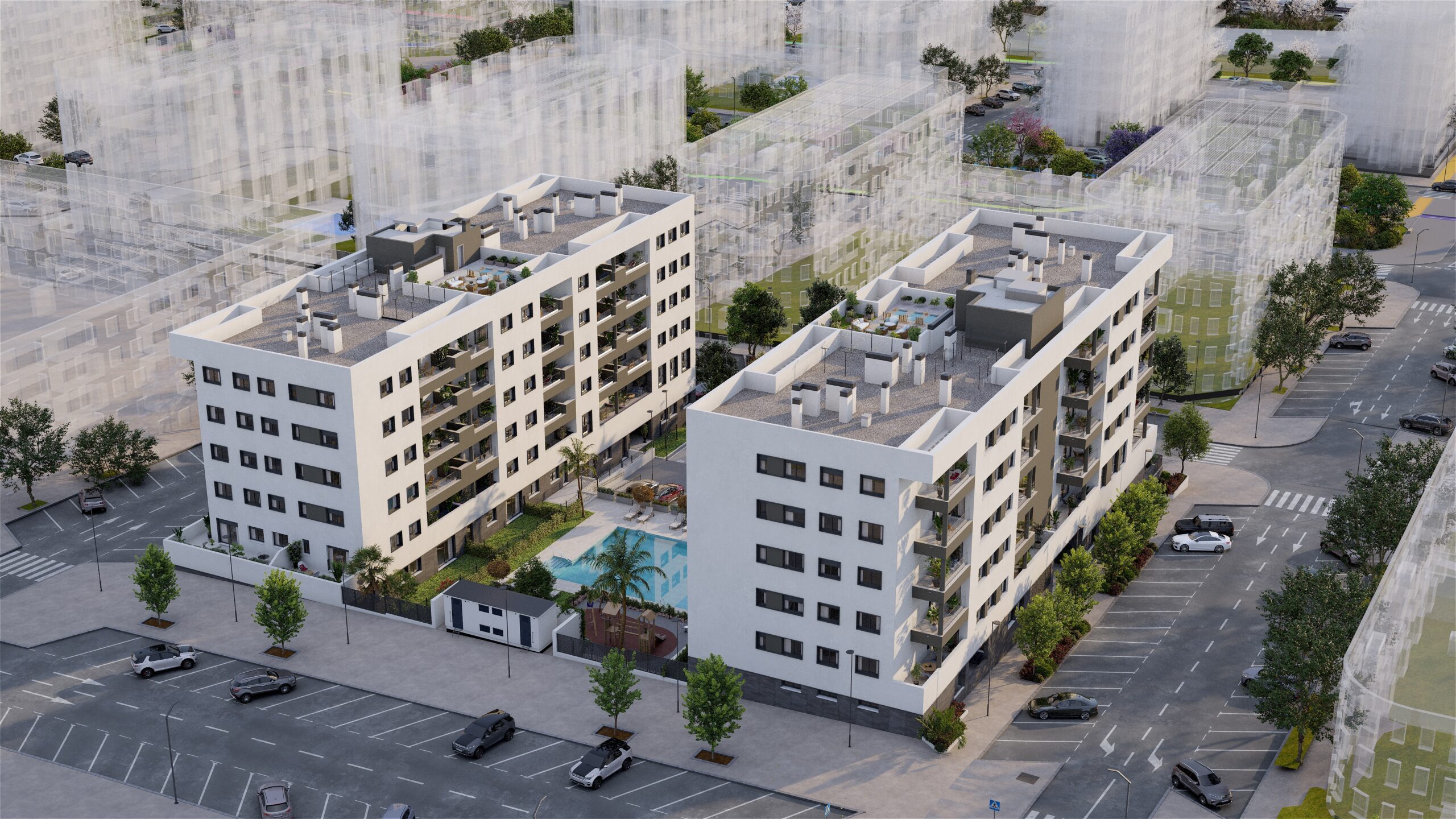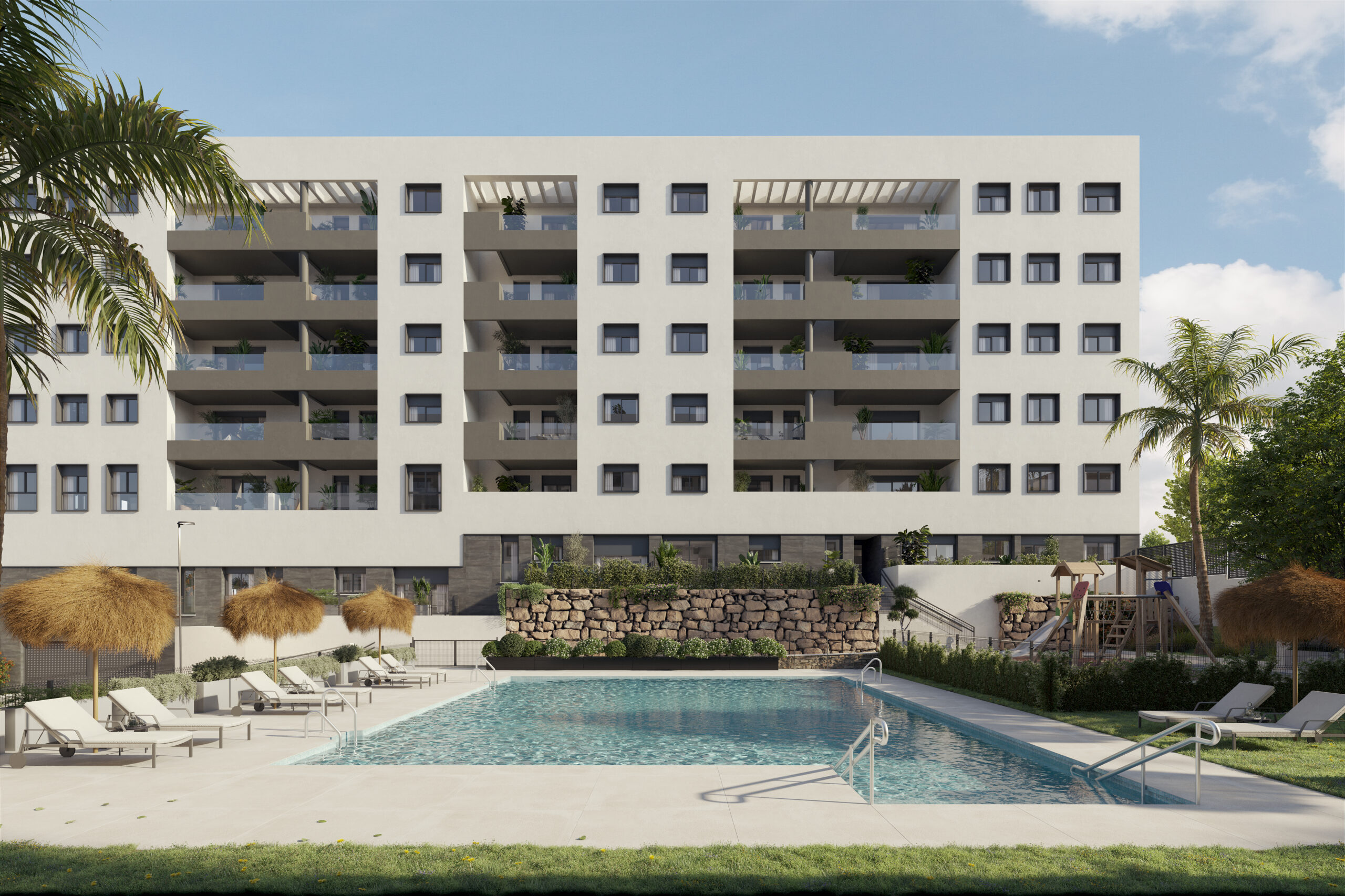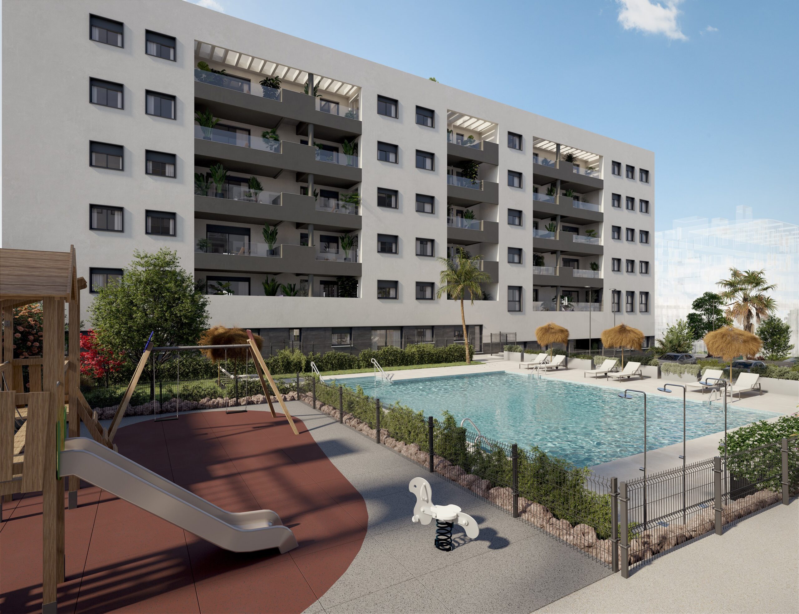 Your new home in Distrito Zeta, Málaga City! Discover 2- to 3-bedroom apartments equipped with parking and storage, and enjoy a swimming pool, gym, gourmet lounge, zen space, landscaped gardens, and playgrounds in Málaga’s most promising neighborhood. Our new residential complex redefines the concept of modern living in the vibrant Distrito Zeta, Málaga’s most up-and-coming neighborhood.