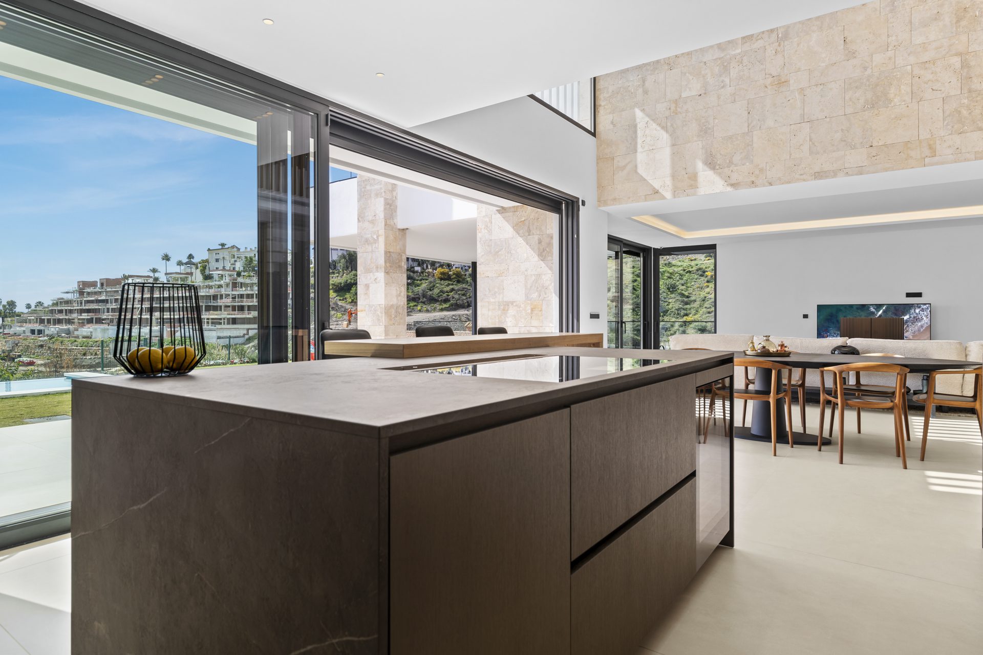 Upstairs, a generous master suite with a dressing area is accompanied by two further en-suite bedrooms, each with direct access to a terrace capturing partial sea views.