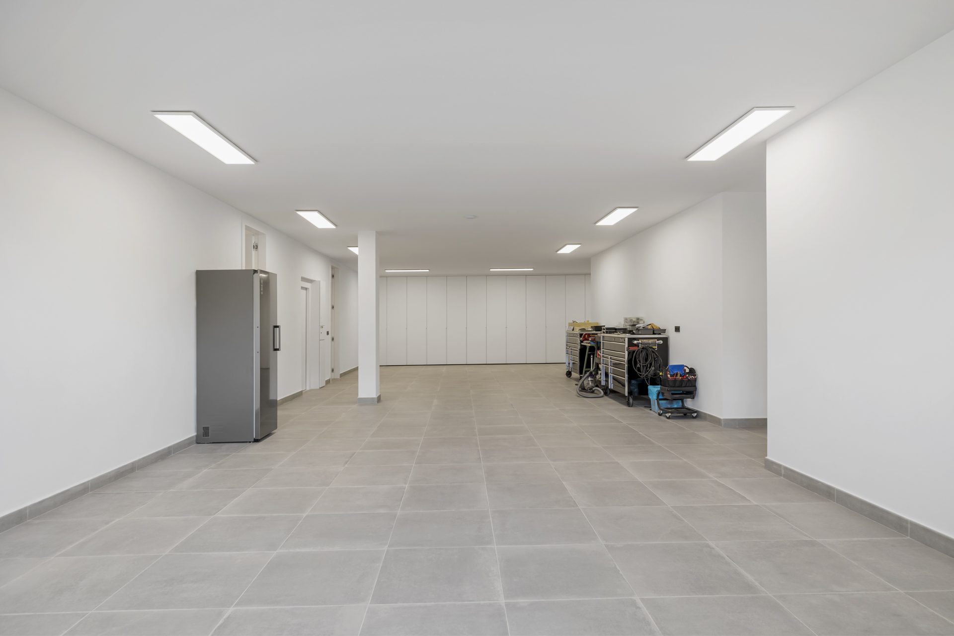 On the lower floor, a versatile multipurpose space offers additional living or leisure options, alongside another guest toilet, storage rooms, and an integrated garage for two cars. There is also a covered carport with space for two additional vehicles.