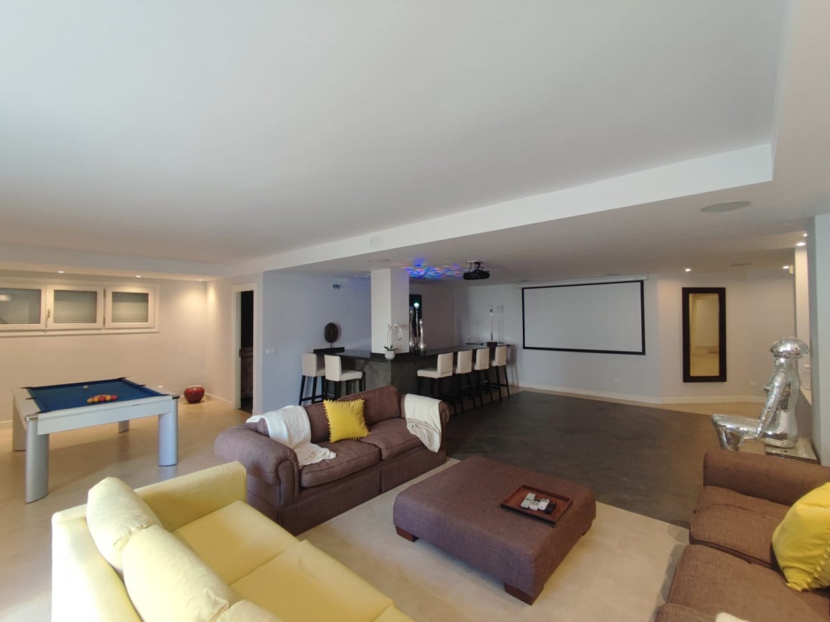 The home entertainment level has a guest/staff apartment with an en-suite bedroom, and a fitted kitchen, leading through to a large home cinema area with direct access to the pool.