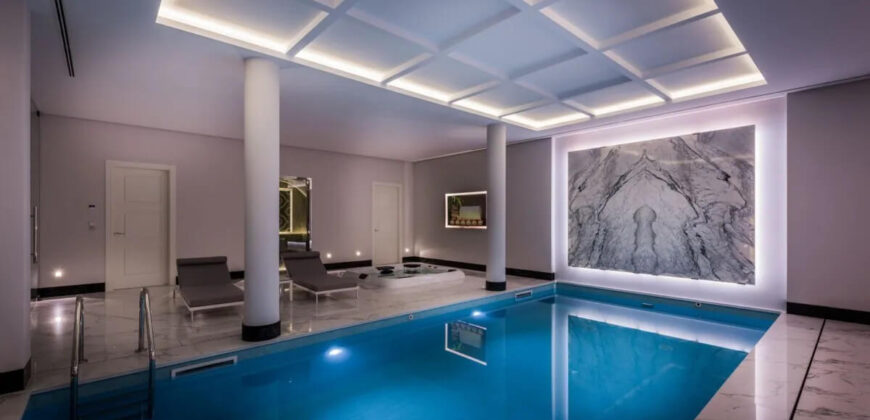 In the basement there is a gym, cinema, indoor swimming pool, spa zone and another apartment for the staff with bedroom en suite and small kitchen. Garage for 4 cars.