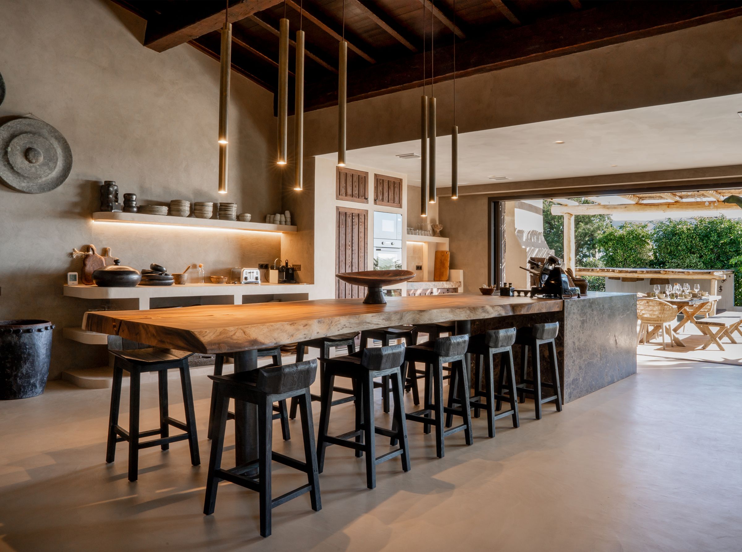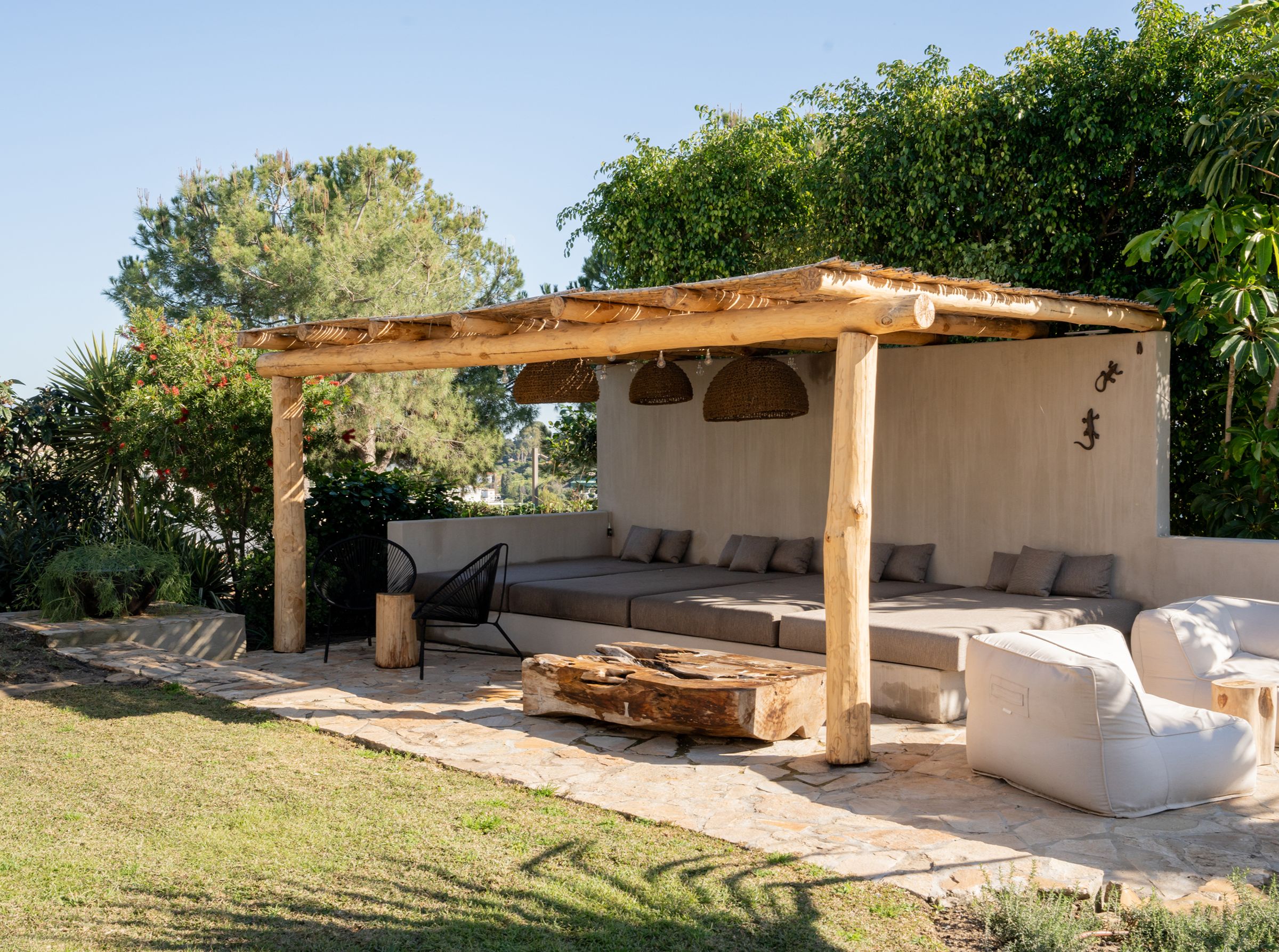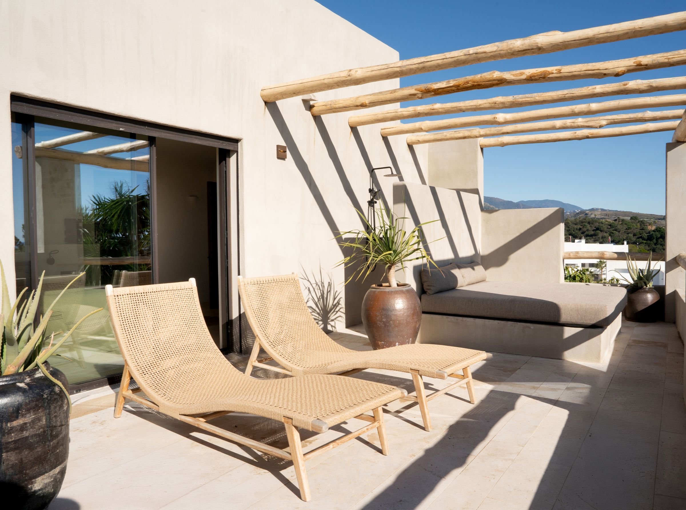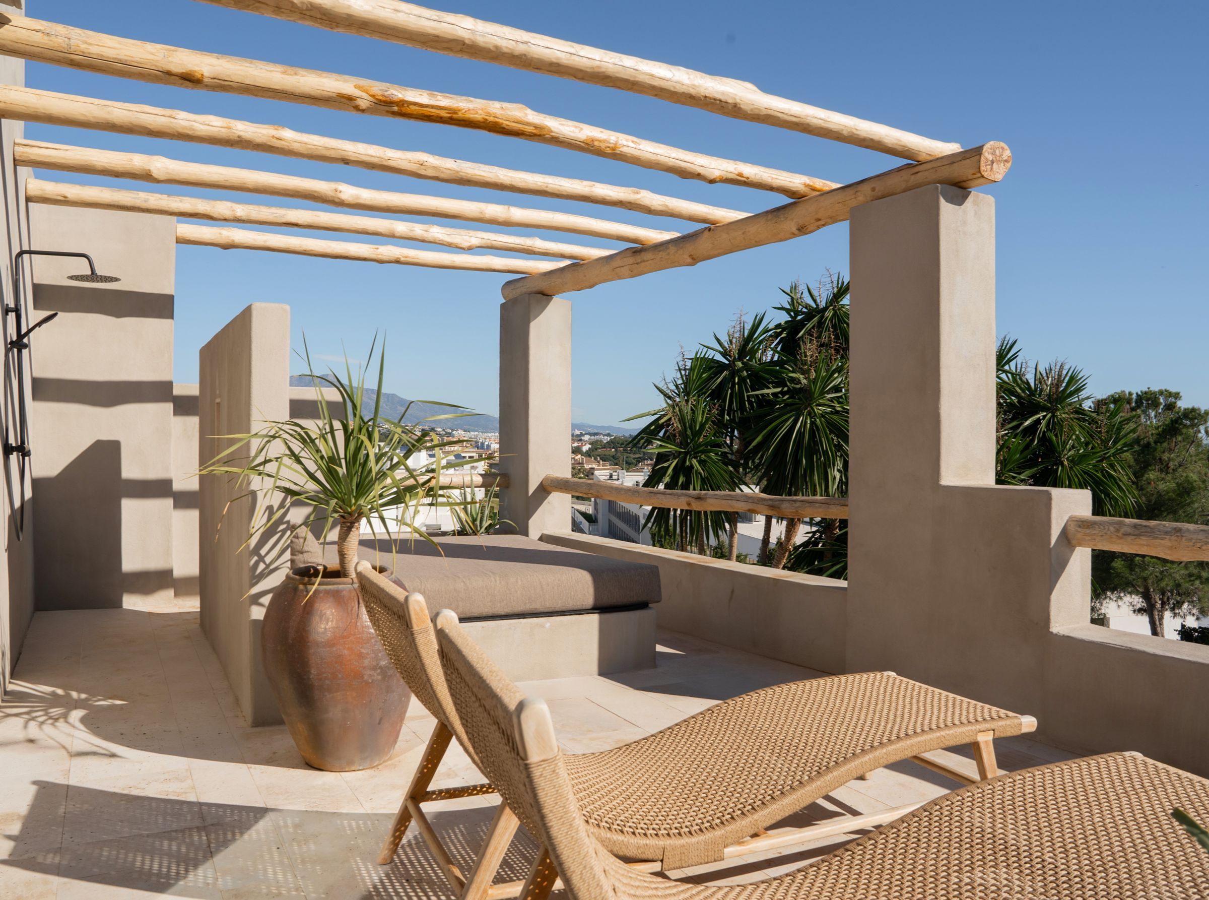 A truly unique property, fully renovated in 2024, blending inspirations from Mexico, Thailand, Ibiza, and Andalucia. Situated in the emerging area of Selwo, this villa offers stunning sea views from the garden and swimming pool level. This exceptional home features 5 spacious bedroom ensuites spread over two levels, a cozy living room with a working fireplace, and a spectacular open-plan kitchen with dining area, storage, and a guest cloakroom. The exterior boasts a shower room for the heated infinity pool and a carport for two cars. Primarily south-facing, the property is surrounded by a beautifully landscaped garden with various seating areas, a pétanque court, and an exotic pergola with a lounge corner perfect for relaxation. The main terrace includes an Argentinian barbecue and an elegant wooden table for al-fresco dining. The master suite occupies the entire upper floor and features a private open terrace with sun lounger, an outside shower and the suite offers a spectacular dressing room and complete bathroom with bath and shower. The villa’s unique design incorporates polished concrete floors throughout, underfloor heating in all bathrooms, additional wall insulation, and individual air conditioning units for both heating and cooling, as well as ceiling fans. Sustainability is a priority, with 24 solar panels installed to supply hot water and heat the swimming pool. Located less than 1 km from the beach, the property is within walking distance of three restaurants, the beach, a new padel tennis club, and a short drive to Estepona (10 minutes), Puerto Banús (10 minutes), and Malaga Airport (45 minutes). This architectonic masterpiece, both in the house and garden, is truly incomparable on the coast.